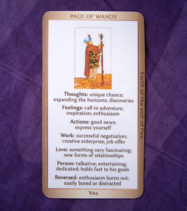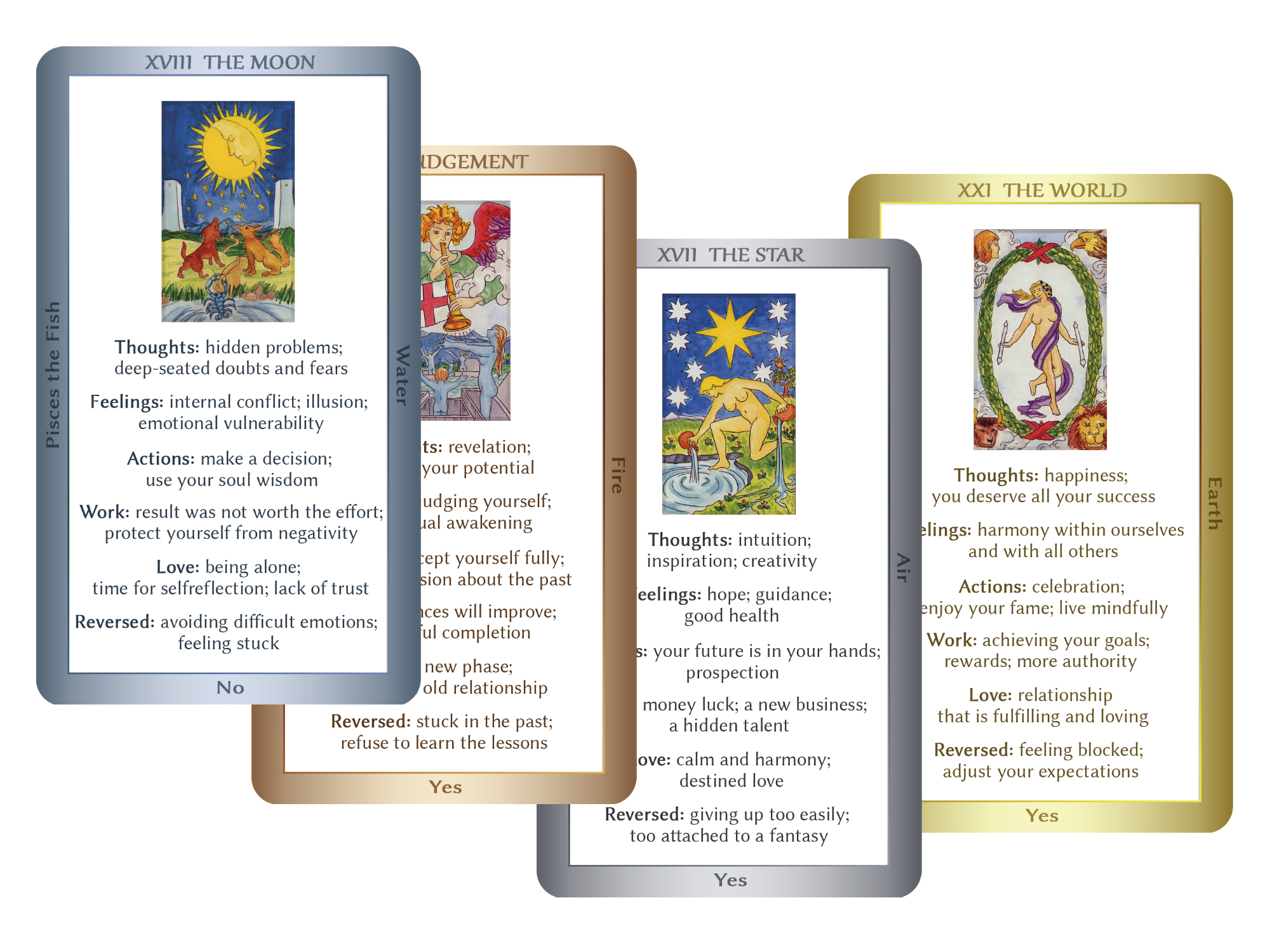 The answers fit to the common spread questions – the thoughts, feelings or actions. So when you get a card for the certain position in your spread, you can know what does that card mean in this particular place.