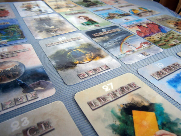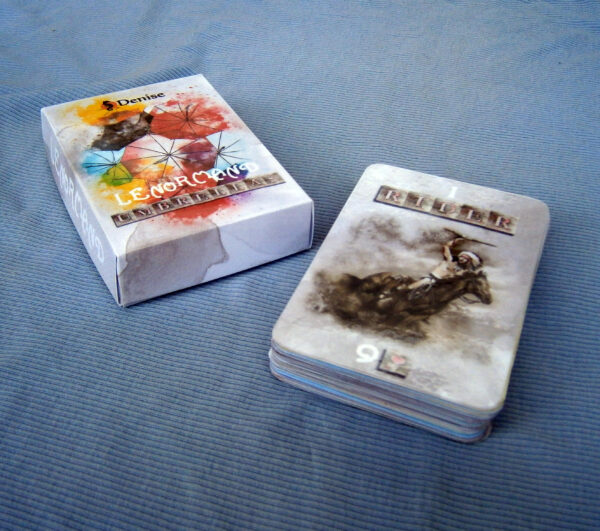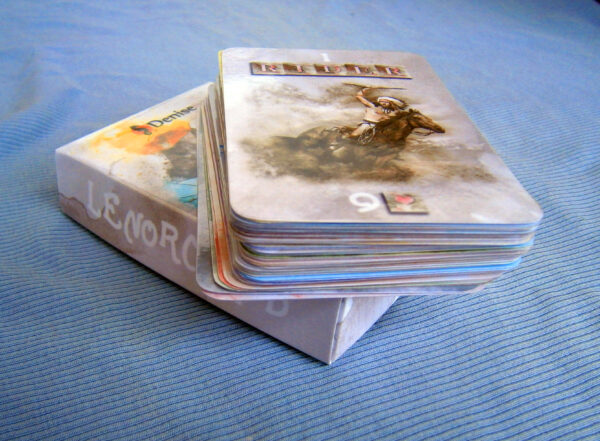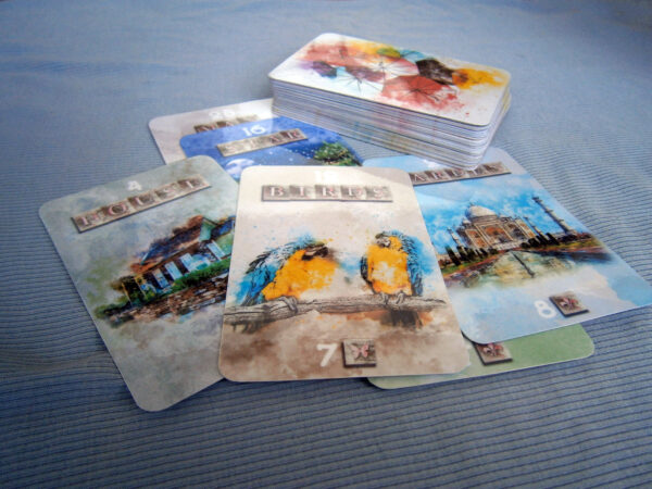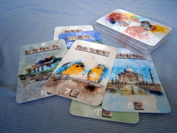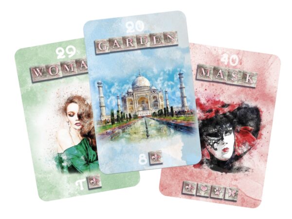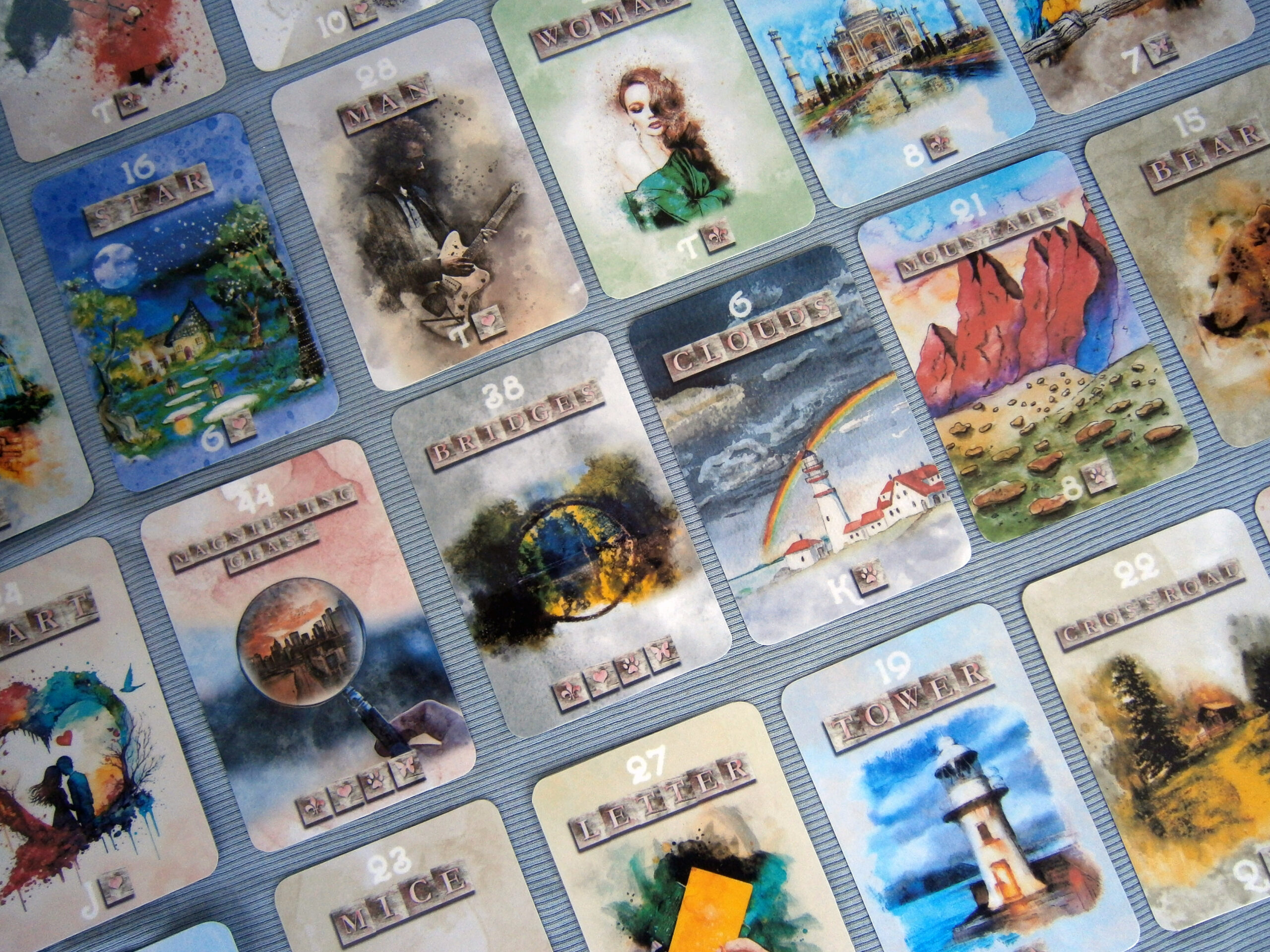 The deck has 8 additional cards – Time, Well, Dice, Mask, Bridges, Compass, Maze and Lens. The Woman and Man cards are doubled. And the 12-th card is presented as Birds and Owls.
